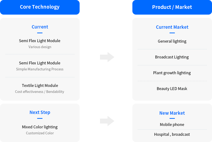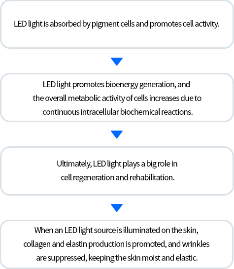 | Apply cosmetics to the epidermis. Most cosmetics with large molecular weight have difficulty penetrating the dermis layer → limited to moisturizing the epidermis layer rather than absorption helps | Using LED light sources in an appropriate wavelength band to promote collagen and elastin production → Maximize the product effect by using cosmetics and LED light sources at the same time |