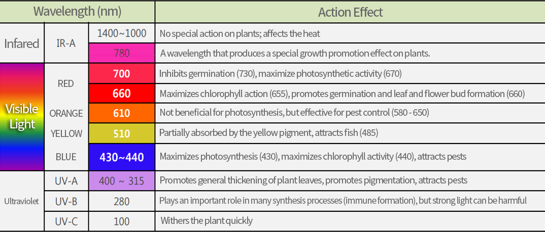 Principle and effects : Specific wavelength bands help plant growth and have human treatment effects
